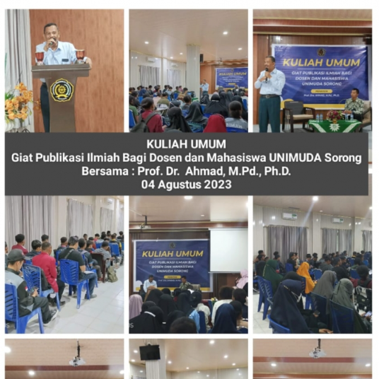 Sorong Papua Barat Daya, 04 Agustus 2023, Program Studi Pendidikan Teknologi Informasi UNIMUDA Sorong mengadakan Kuliah Umum dengan Tema “Giat Publikasi Ilmiah bagi Dosen dan Mahasiswa UNIMUDA Sorong”, kegiatan ini dihadiri dosen dan mahasiswa. Kuliah Umum dibuka dan dimantik oleh Dr. Budi Santoso, M.Pd. dengan menjelaskan peran publikasi dalam ruang lingkup dosen dan mahasiswa, dan dijelaskan secara terperinci oleh Prof. Ahmad, M.Pd., P.hD. disambutannya beliau berkata “mulailah berlatih menulis. Karena dengan kebiasaan menulis berbeda dengan membaca dan bertanya. Oleh karena itu perlu pembiasaan yang berkesinambungan”